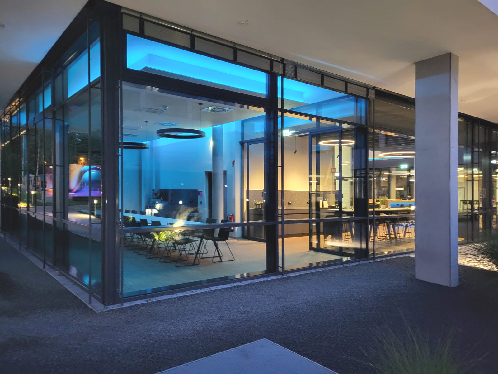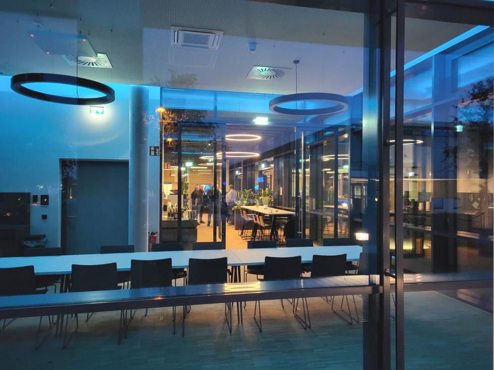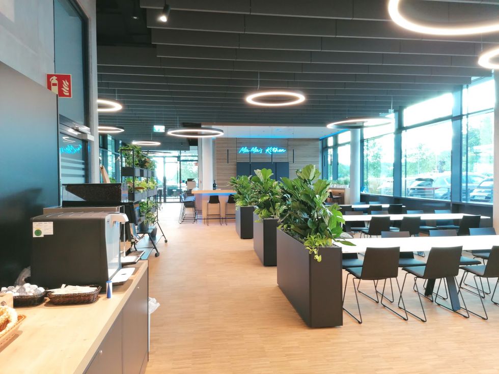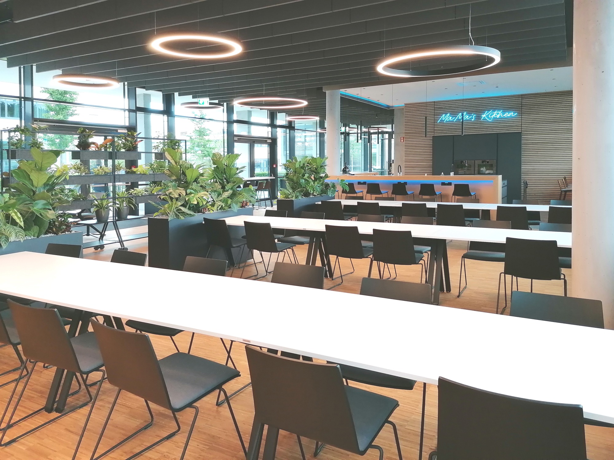 Als weiterer Baustein der notwendigen Erweiterung des Camlog Gebäudes wurde Mitte des Jahres 2025 das dringend benötigte Personalrestaurant im Erdgeschoss fertiggestellt, zusammen mit einem großzügigen Besprechungsraum zur Straße hin.