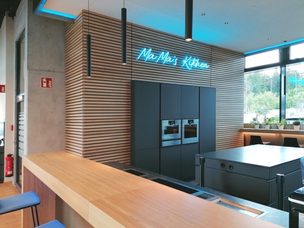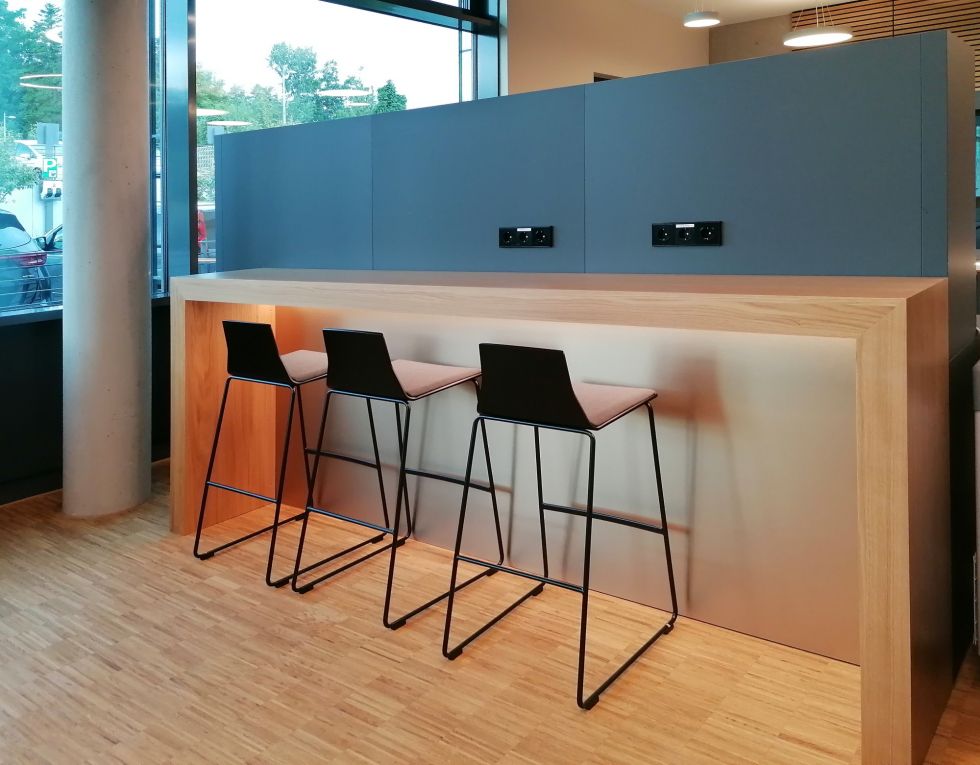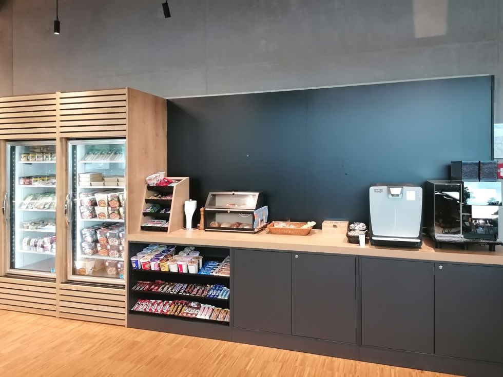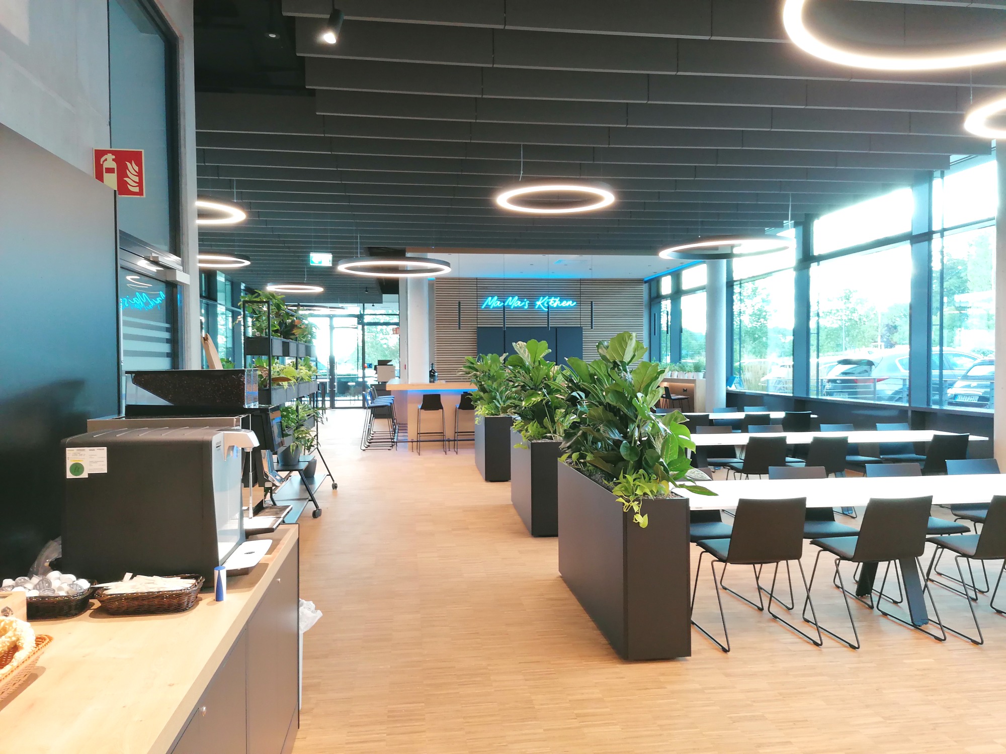 Ziel war es, einen wohnlichen, zum Aufenthalt einladenden Raum zu schaffen. Die verwendeten Materialien wie Eichenparkett, dunkle Fliesen in den Ausgabe- und Eventküchenbereichen, Wandverkleidungen mit Eichenholzelementen auf dunklem Tragprofil und sichtbare, schwarz beschichtete Deckeninstallationen mit abgehängten Akustiksegeln schaffen die geplante Atmosphäre des Gesamtraumes.